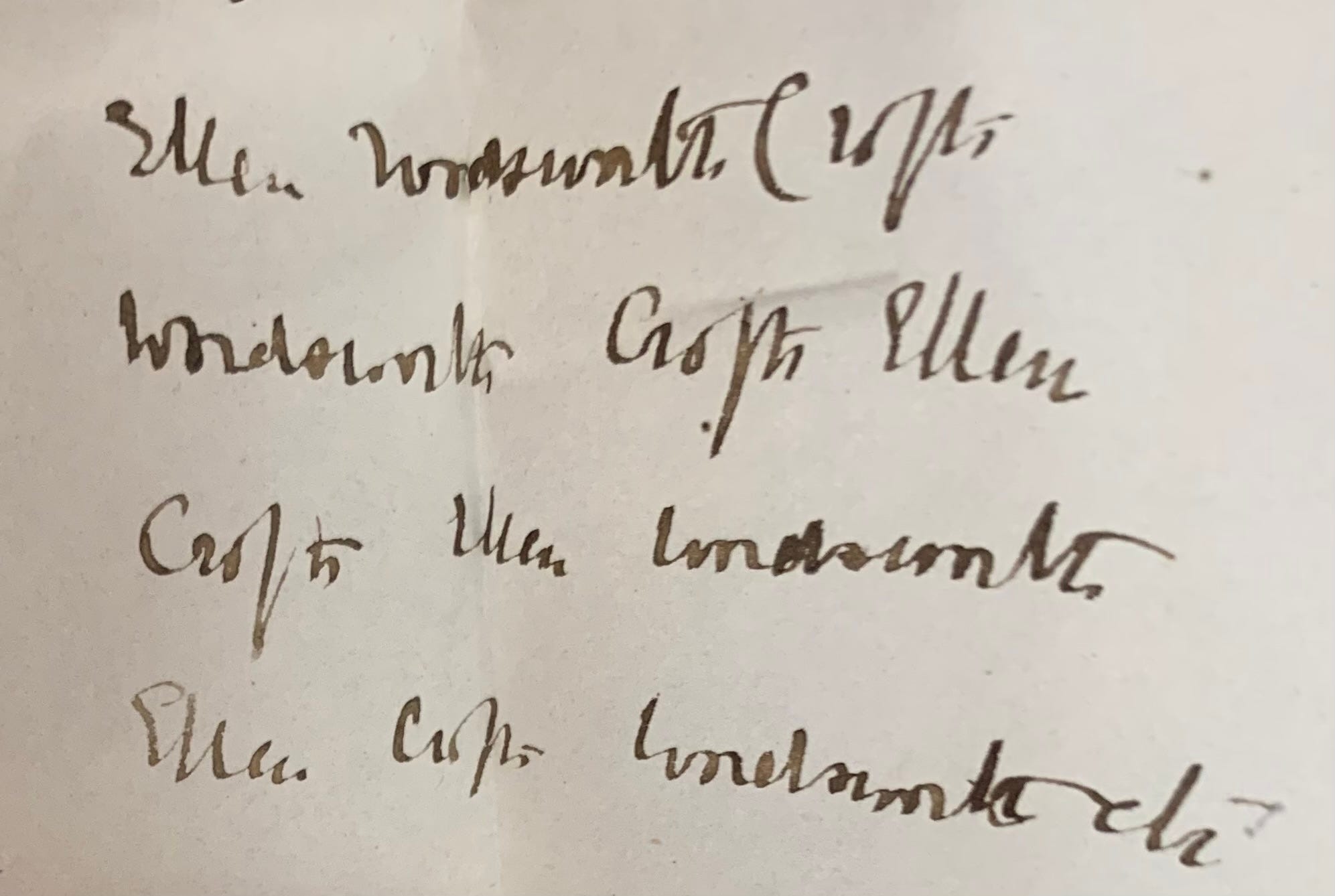 Speaking of scribbles, this week I’ve been in the Manuscripts Room at Cambridge University Library, reading some of the scholar Ellen Wordsworth Darwin’s first love letters to Francis Darwin from 1883. She was then 27-year-old Ellen Wordsworth Crofts, a lecturer in English literature at Newnham College and he was a 34-year-old botanist and widower who had recently moved to Cambridge with his young son Bernard and his widowed mother Emma Darwin. Ellen and Francis fell in love, married, and had a daughter, Frances (Cornford). In the 1890s Ellen Wordsworth Darwin was invited to join the Cambridge Ladies’ Dining Society, an exclusive dining group of twelve women who regularly met for serious intellectual discussion. So I was pleased to find, in a jumbled pile of her letters in the archive, evidence of her humour and Lear-like zest for language in her letters, when she rearranges her signature in four different ways to make Francis laugh: ‘Ellen Wordsworth Crofts/ Wordsworth Crofts Ellen/ Wordsworth Ellen Crofts/ Ellen Crofts Wordsworth etc’