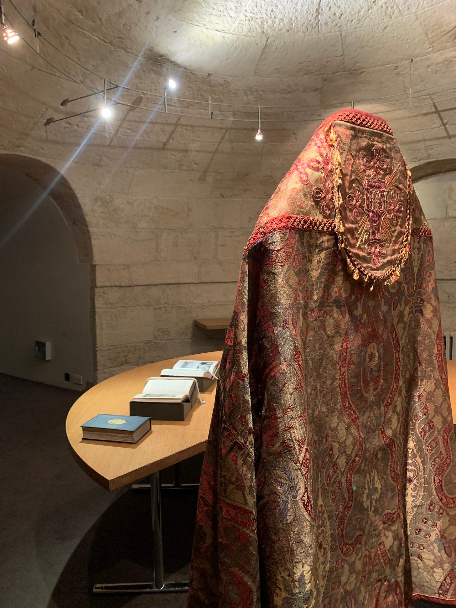 Amazingly, the real object was on display during my talk, in the circular room called, delightfully, ‘the beehive’. You can see my photo of it below. It’s made of red and gold silk with golden Japanese thread, and was made from material intended to be used for the coronation robe of Victoria, Princess Royal when she became German Empress and Queen of Prussia in 1888. But sadly, her husband died before the coronation took place, so instead it was made into a cope for the Bishop of London. Mandell Creighton wore it in 1897 for the St Paul’s service celebrating the Queen’s Diamond Jubilee. As he stood with the Archbishops on the steps of St Paul’s to welcome the Queen in her carriage, an awestruck reporter from the Daily Chronicle reported ‘His cope was of a stuff that taxes possibility of description… upon his head he wore a skull-cap of pure cloth of gold.’ When Queen Victoria later wrote to thank Mandell, she told him she had worried about him overheating in the sunshine.