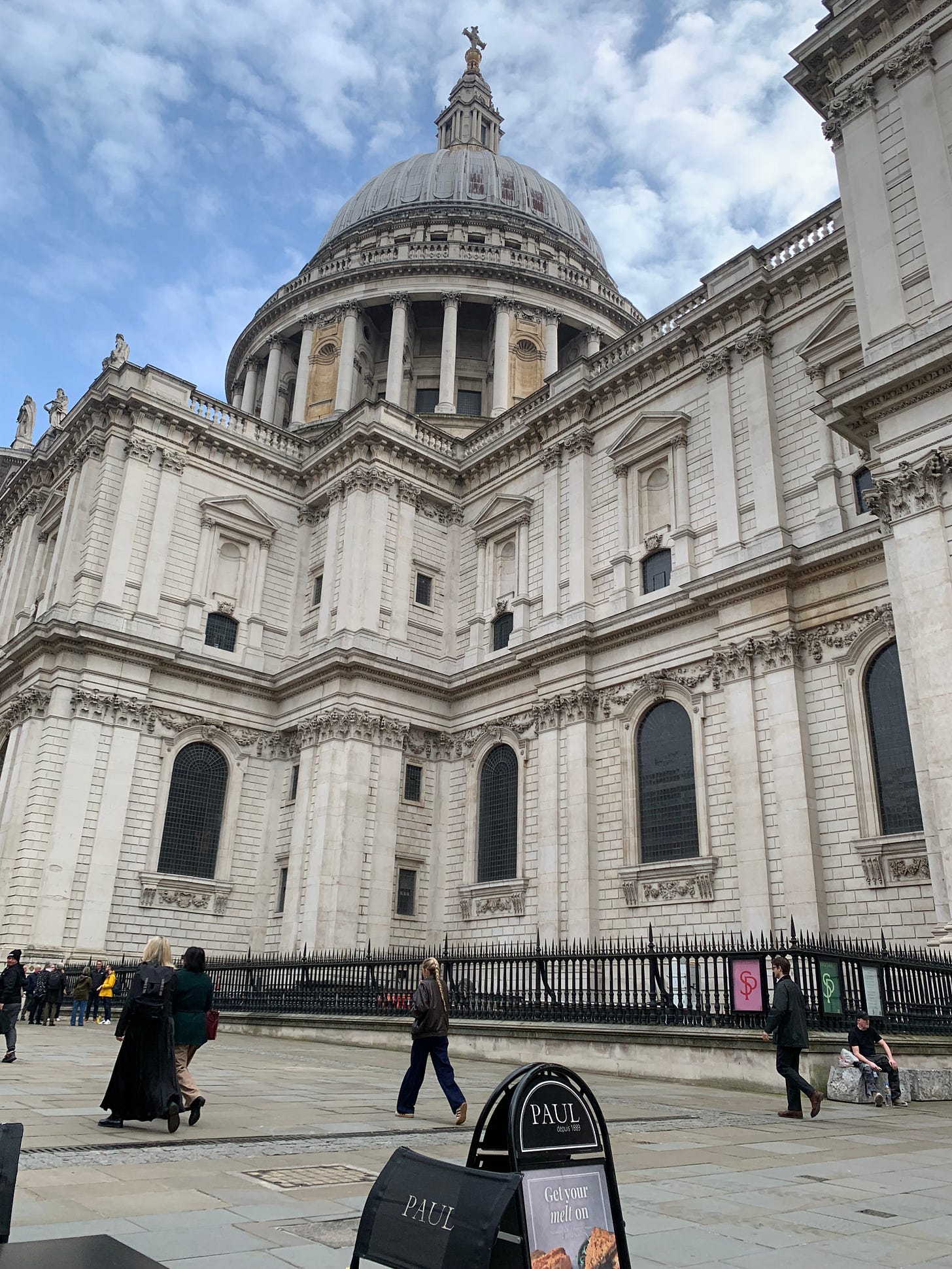 I arrived in busy Ludgate Hill early by train and, given the mild spring sunshine, decided to have my lunch outdoors at the aptly named café in the photo below. There were lots of office workers strolling past on their lunch break, a pensive-looking builder sitting on a block of stone and French teenagers everywhere, laughing and taking photogenic snaps of each other with St Paul’s dome as a backdrop. More worryingly for me, a rather tough-looking gang of London pigeons was demolishing leftovers on a table nearby. I feared they might be coming for my baguette for their next course, so decided to descend the steps opposite to the peace and safety of the St Paul’s Crypt.