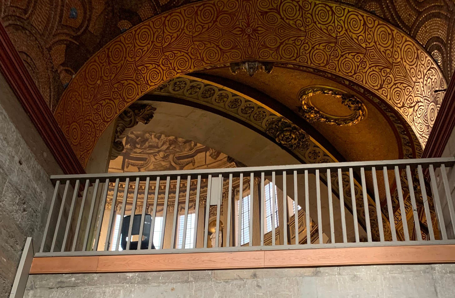 Carrying an armful of books, the organizer kindly led me up Wren’s ingenious cantilevered spiral ‘Geometric stair’ (there are some lovely photos of it here). We arrived on the Triforium, or interior gallery level, where, after carefully stepping over pipes and squeezing through a stone passageway, I looked up to see a mosaic ceiling that was as intricately decorated as Mandell Creighton’s cope (see my photo at the top). Just audible in that cool shady corridor was the sound of a choir practising on the cathedral floor far below. After going through a set of double oak doors I found myself in one of the best preserved eighteenth-century interiors in London, which – remarkably – has been kept in service since it opened in 1709 until it was closed for the four-year restoration project which began in 2018.